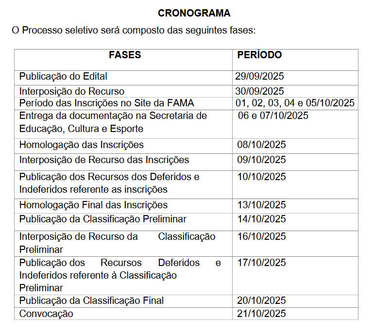 Entrega da documentação na Secretaria de Educação, Cultura e Esporte: 06 e 07 de outubro de 2025, das 07h30min às 11h30min e 13h às 17h
