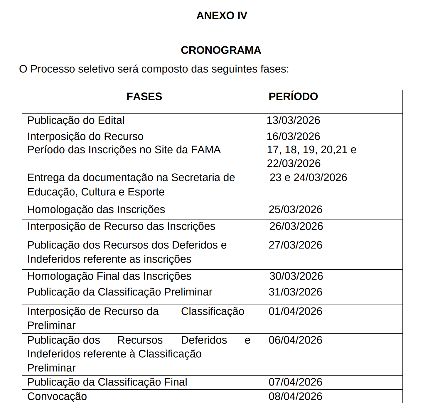 Entrega da documentação na Secretaria de Educação, Cultura e Esporte: 23 a 24 de março de 2026, das 07h30min às 11h30min e 13h às 17h