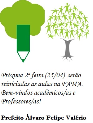Prefeito de Clevelândia, Álvaro Felipe Valério, e Grupo Gestor da FAMA deseja a todos/as acadêmicos/as, servidores/as e professores/as bom retorno e que o período seja concluído com êxito e dentro dos objetivos propostos pela FAMA.