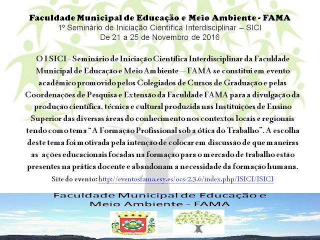 O mês de novembro marcará história no ensino superior de Clevelândia. Será realizado o primeiro evento científico da Faculdade Municipal de Educação e Meio Ambiente – FAMA, com a realização do 1º Seminário de Iniciação Científica Interdisciplinar. Participe!