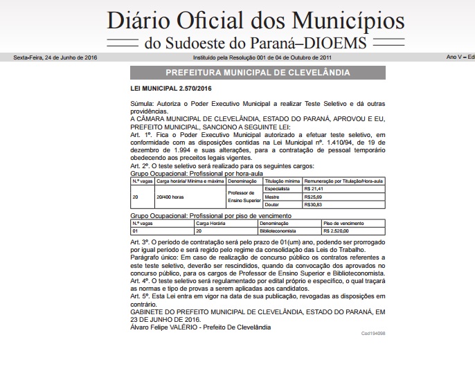 O Prefeito, Alvaro Felipe Valerio, sancionou duas leis que criam e autorizam teste seletivo para contratação de professores em caráter emergencial. As leis foram publicadas no Diário Oficial do Município nesta sexta-feira (24/06). O Edital para a realização do Processo Seletivo será publicado nos próximos dias.