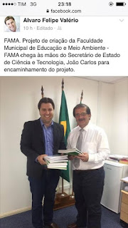 O Prefeito Alvaro Felipe Valerio (PSDB), de Clevelândia, esteve nesta semana participando de uma audiência com o Secretário de Estado da Ciência, Tecnologia e Ensino Superior (SETI), João Carlos Gomes. O motivo do encontro foi debater o credenciamento da Faculdade Municipal de Educação e Meio Ambiente – FAMA.